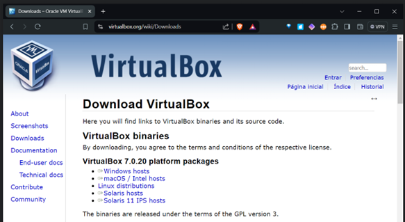 Descarga el software de virtualización VirtualBox según el sistema operativo que actualmente dispongas instalado en tu equipo. Para ello visita el sitio web oficial (https://www.virtualbox.org/).