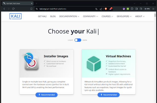 Dado que la plataforma donde se desplegará la máquina Kali es una máquina virtual seleccionáremos Virtual Machines. Se va a a usar VirtualBox como virtualizador, por ello elegimos «VirtualBox» para descargar la máquina ya preparada para este entorno.