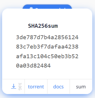 - Como se vio anteriormente en la zona de descarga, hay un botón etiquetado como «SUM». Al hacer clic, se muestra el hash SHA256 correspondiente a la imagen que estás descargando.