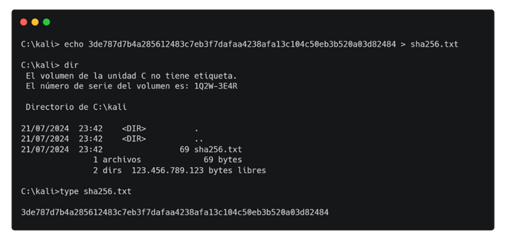 A continuación, consulta en la consola el contenido de SHA256.txt mediante el comando: