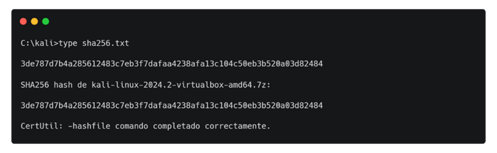 Este comando genera el hash en SHA256 del archivo kali-linux-2024.2-virtualbox-amd64.7z y lo guarda en el fichero sha256.txt a continuación del contenido del fichero.