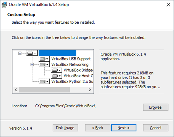 En el siguiente paso le permite elegir dónde instalar Oracle VM VirtualBox y qué componentes instalar.